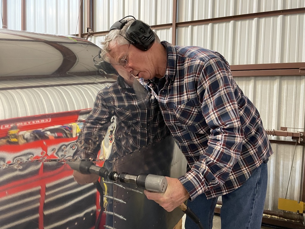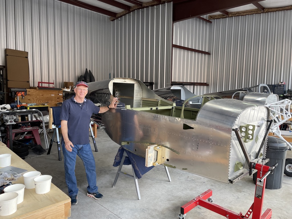 Continue riveting forward fuse to rear fuse. Attach fuse to rotisserie. Start riveting bulkhead.