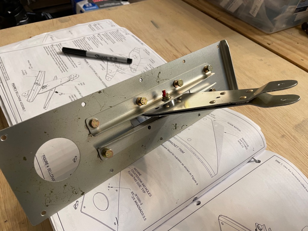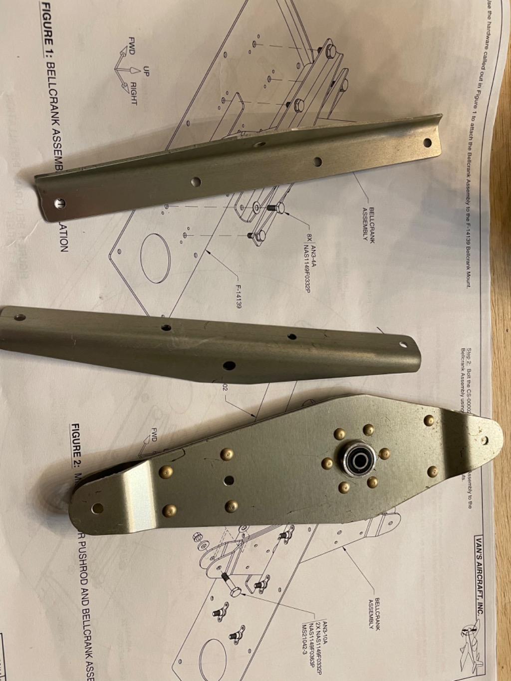 I removed all paper and tape from last painting session. Cleaned up and deburred idler arm bracket. Riveted bell crank and assembled bell rank assembly. Mount bellcrank assembly onto battery angles. Bolted pushrods to idler arm assembly. Torqued and torque sealed all parts. Drilled holes into control sticks.