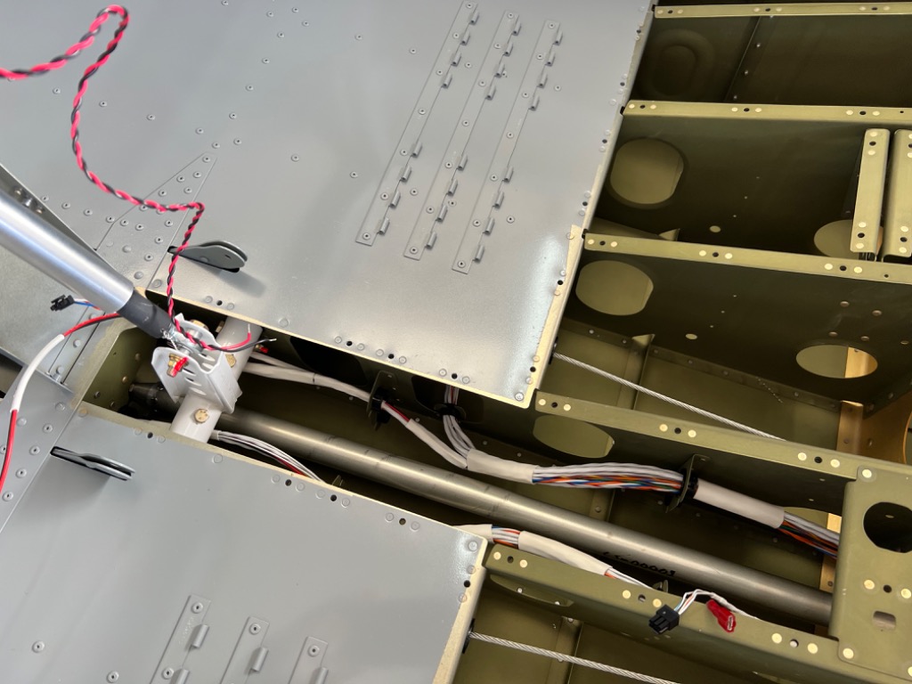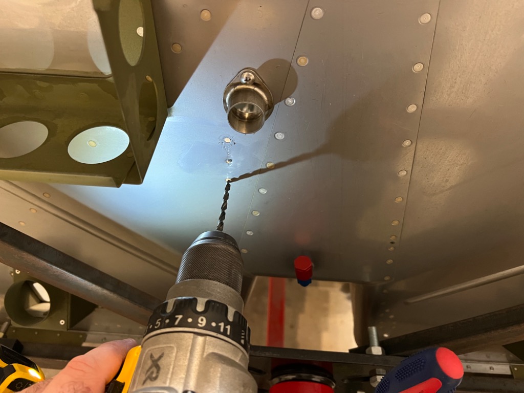 Drilled hole in firewall for exp-119 mod. Began running wiring harnesses in fuselage