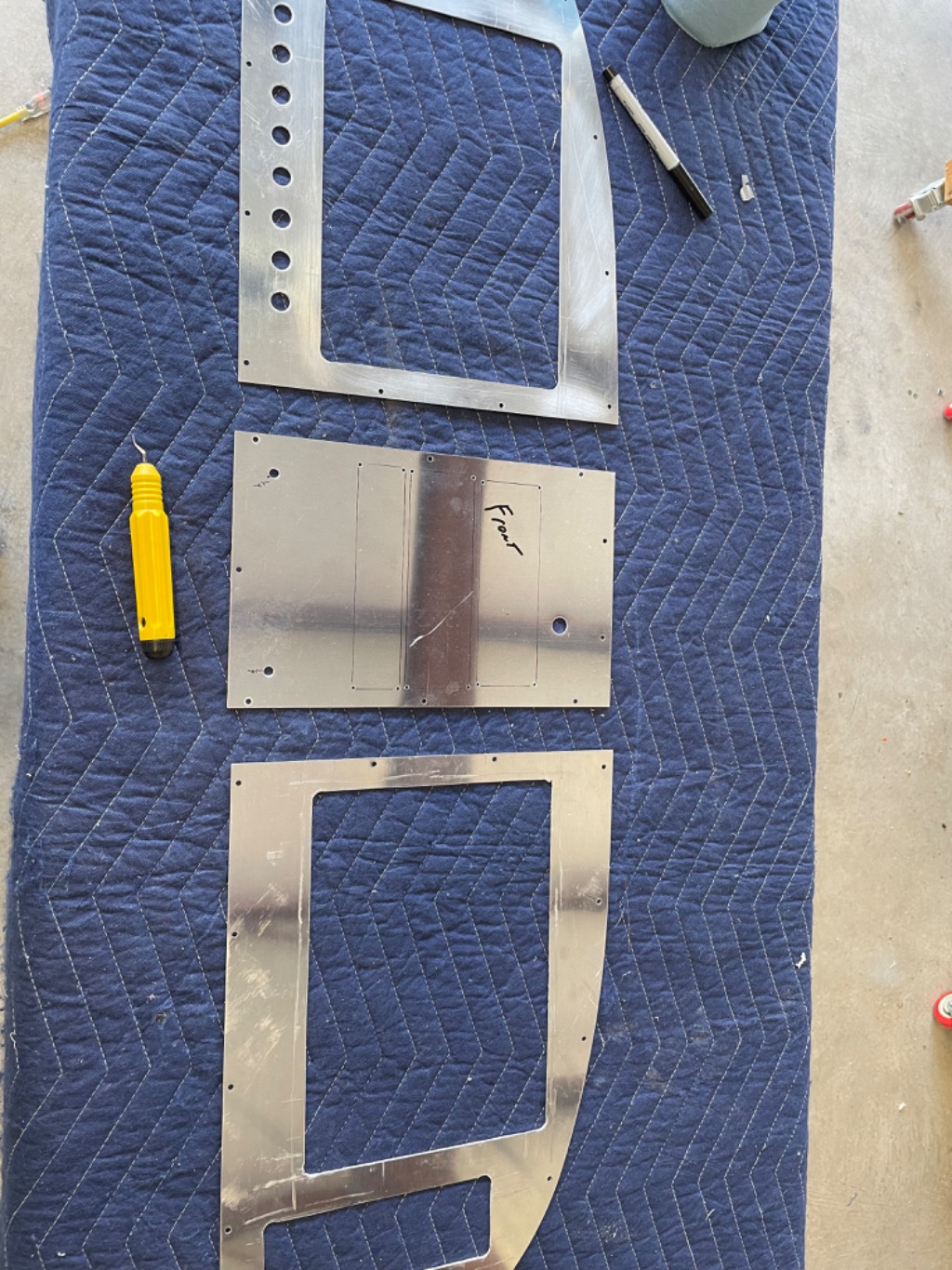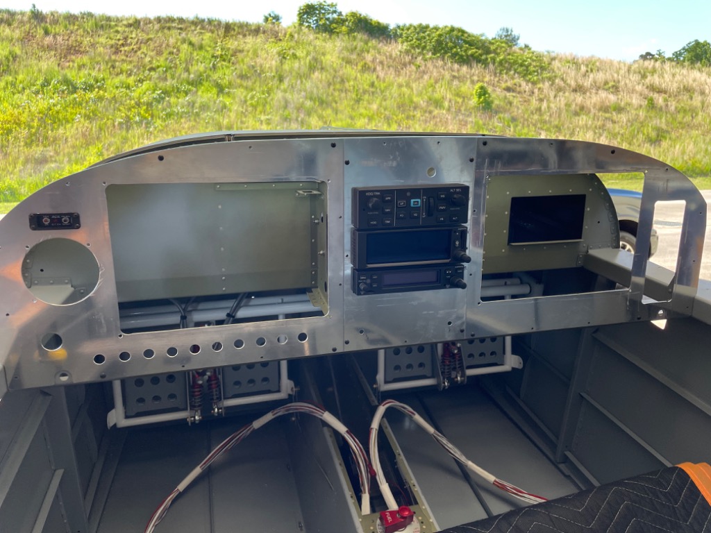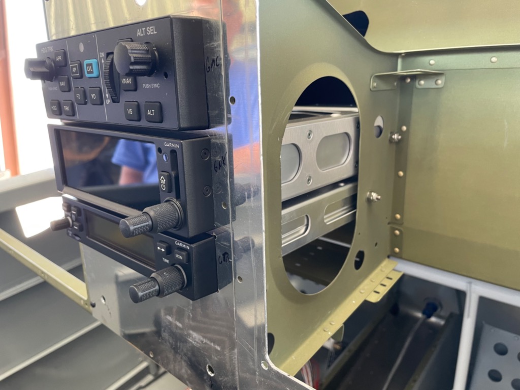 Finished cutting holes in panel blanks. Drilled and screwed radio and gps trays to panel. Drilled and tapped holes for ELT switch. Test fit components.