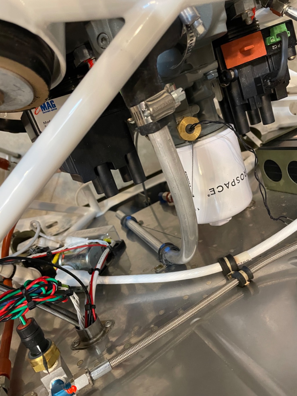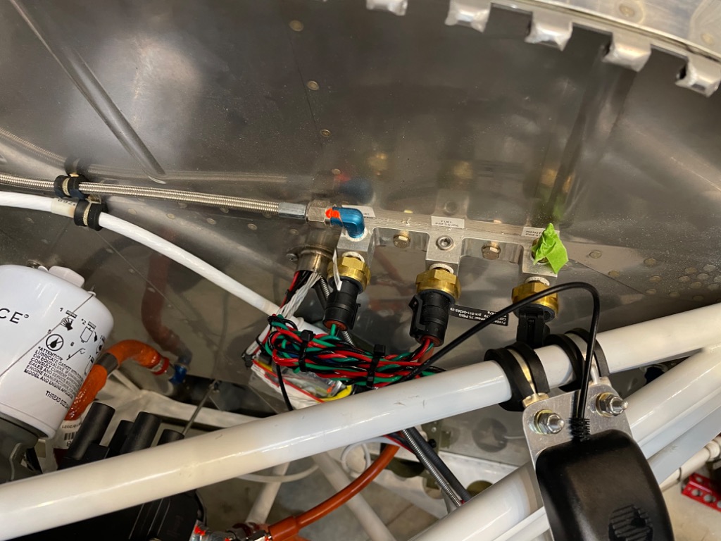 Wired fuel pressure, manifold pressure, and oil pressure sensors. Tested operation. Installed breather tube. Started oil cooler installation.