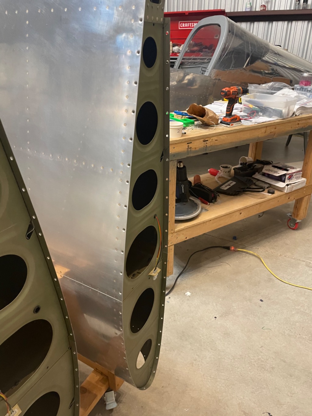 Drilled, countersunk and attached nut plates on left wing tip. Started wing tip lens