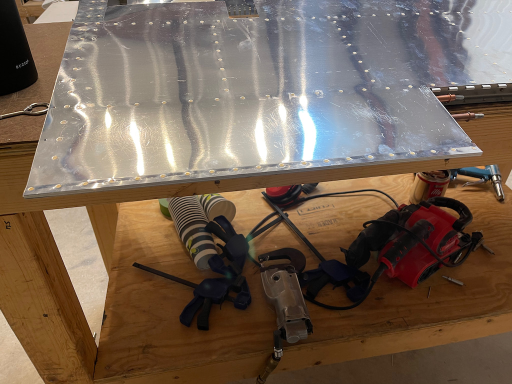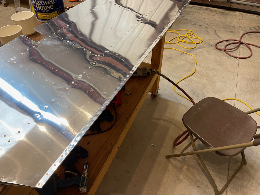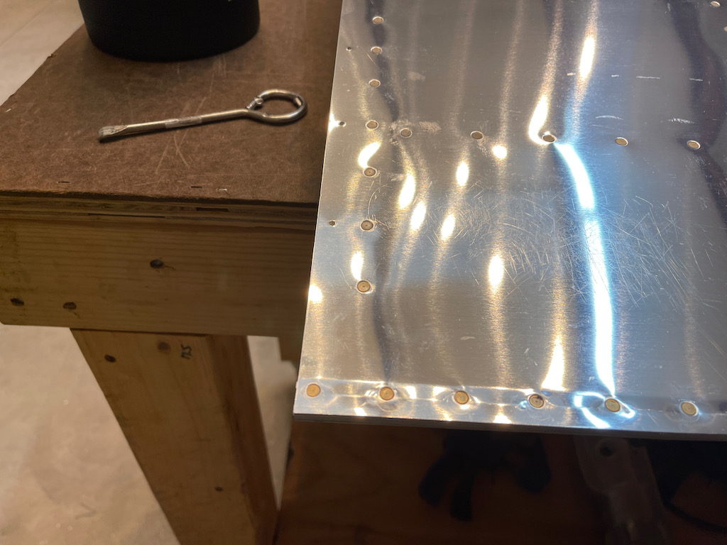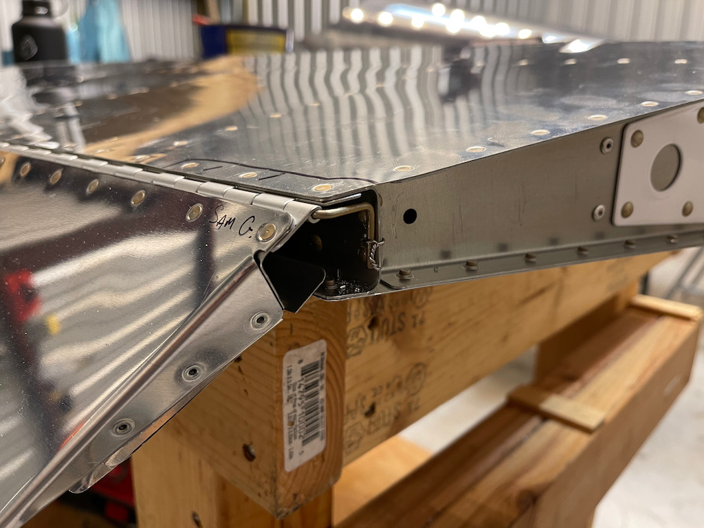 Riveted trailing edge. Trim tab hinge. Began installing trim tab components.